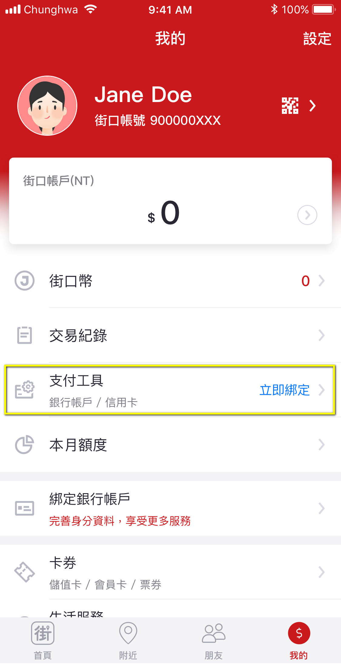 點選「我的」>「支付工具」。