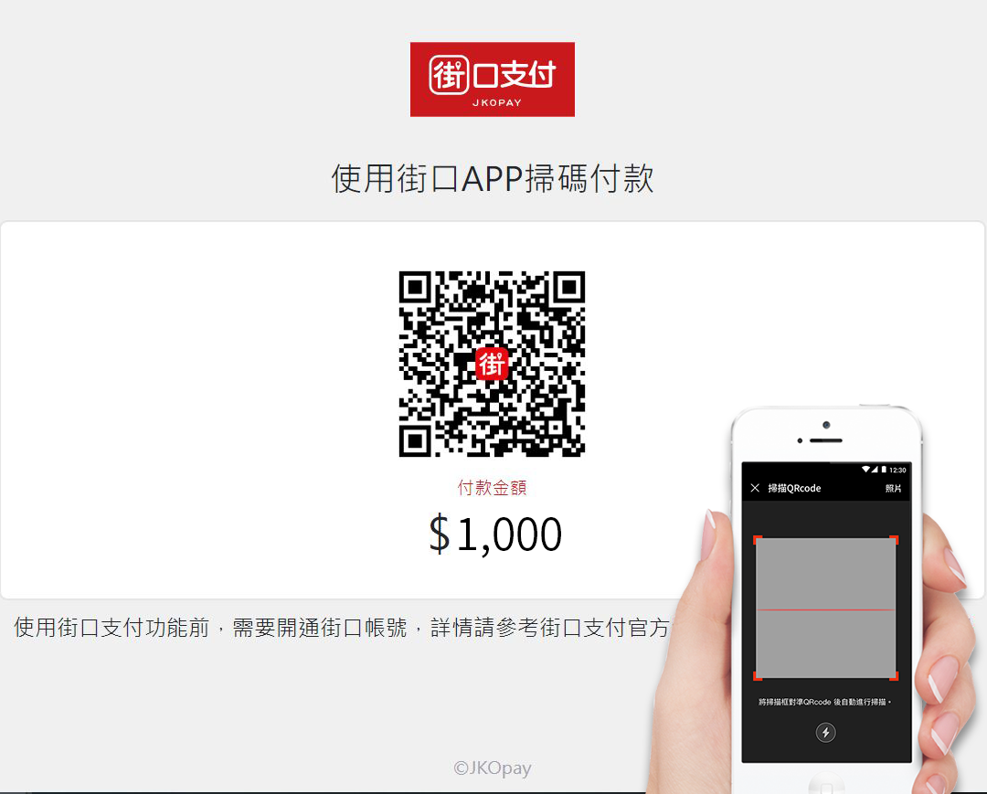 當您選擇街口支付結帳時,電腦畫面將顯示「付款QR Code」,請使用手機開啟「街口支付APP」>點選「掃描條碼」。