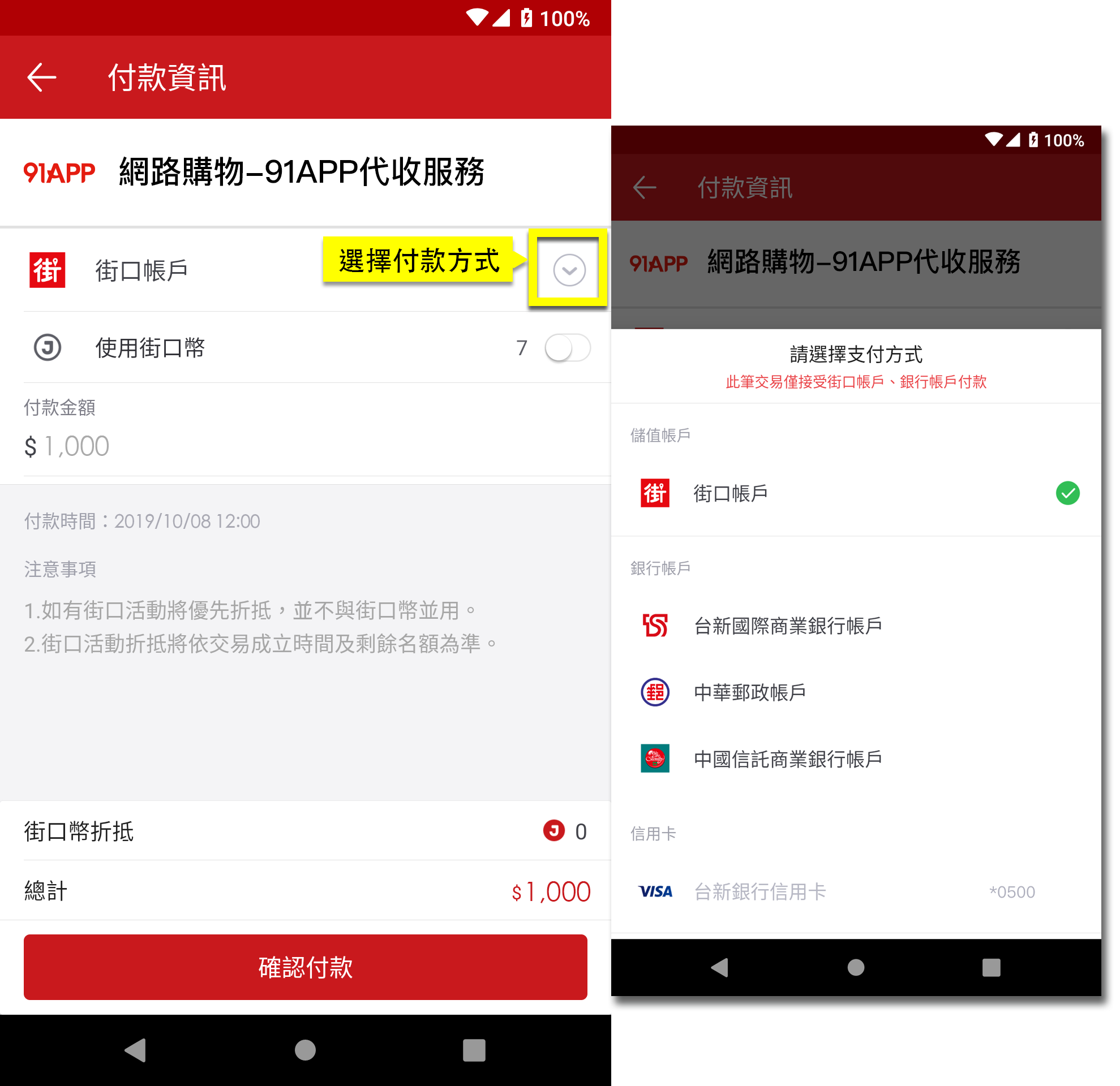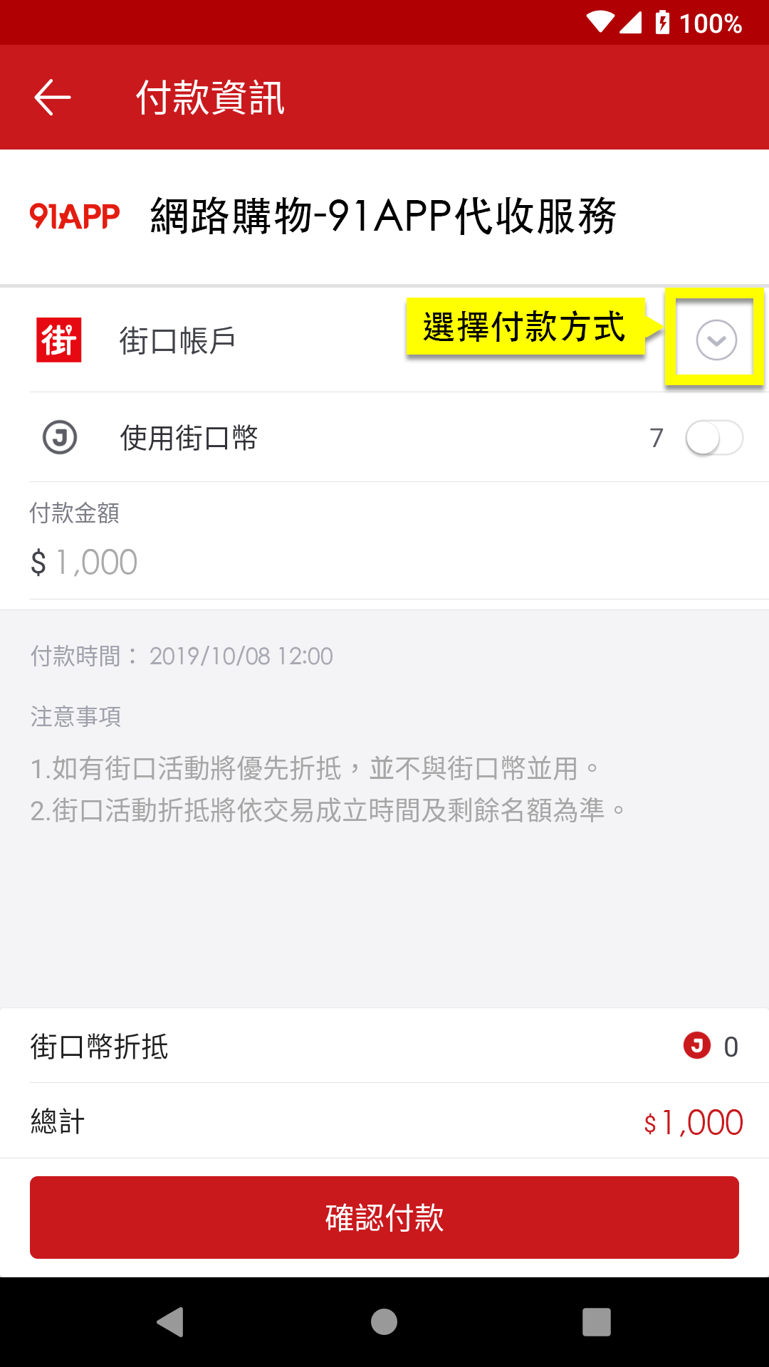 請選擇使用「街口帳戶」餘額付款或連結「銀行帳戶」扣款,選定後系統將自動跳出確認付款資訊,按「確認付款」即完成付款。