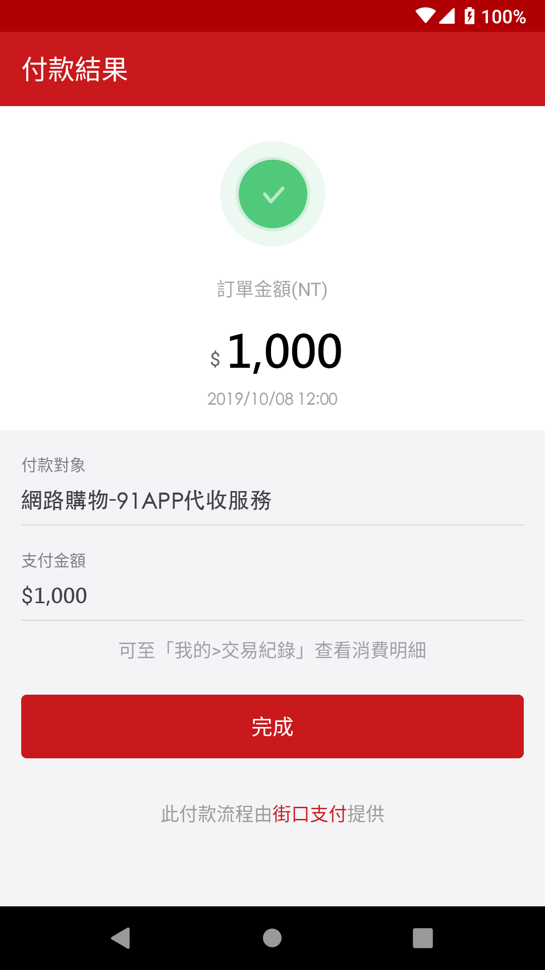 完成付款後,可至>我的>交易紀錄,查看交易明細。