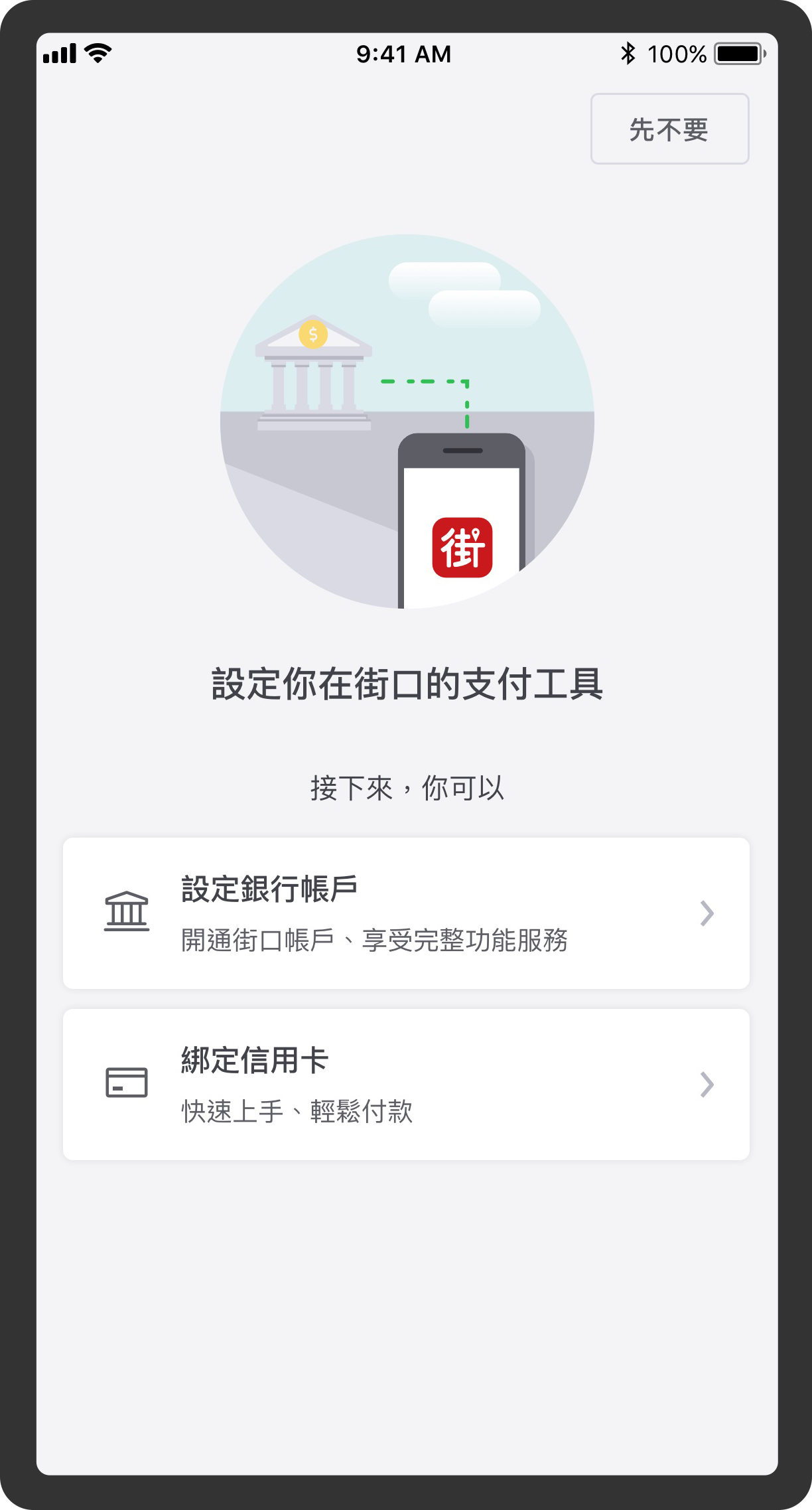 點選「設定銀行帳戶」或「綁定信用卡」,依據各銀行流程完成驗證設定。