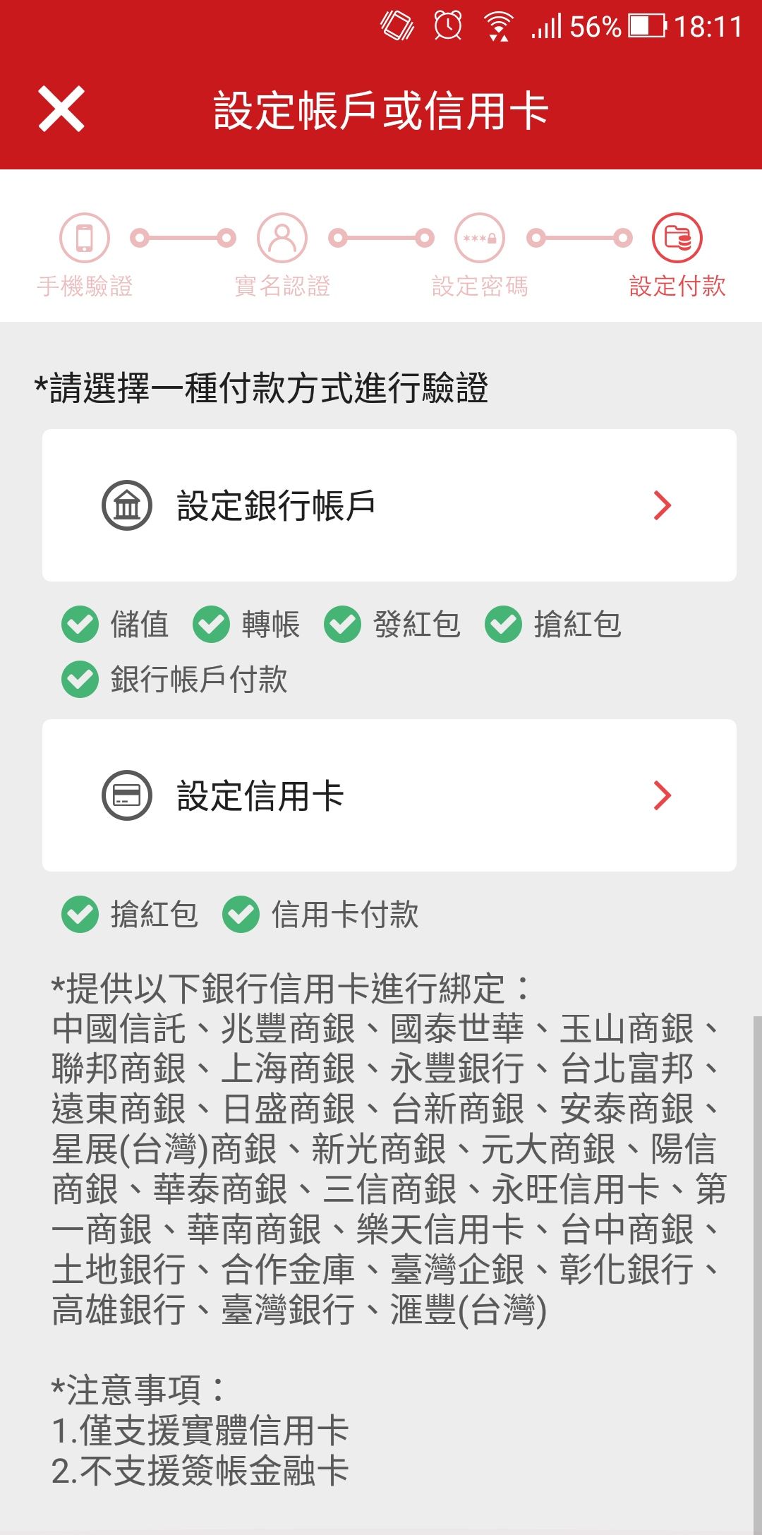選擇「設定銀行帳戶」或「設定信用卡」,依據各銀行流程完成驗證設定。