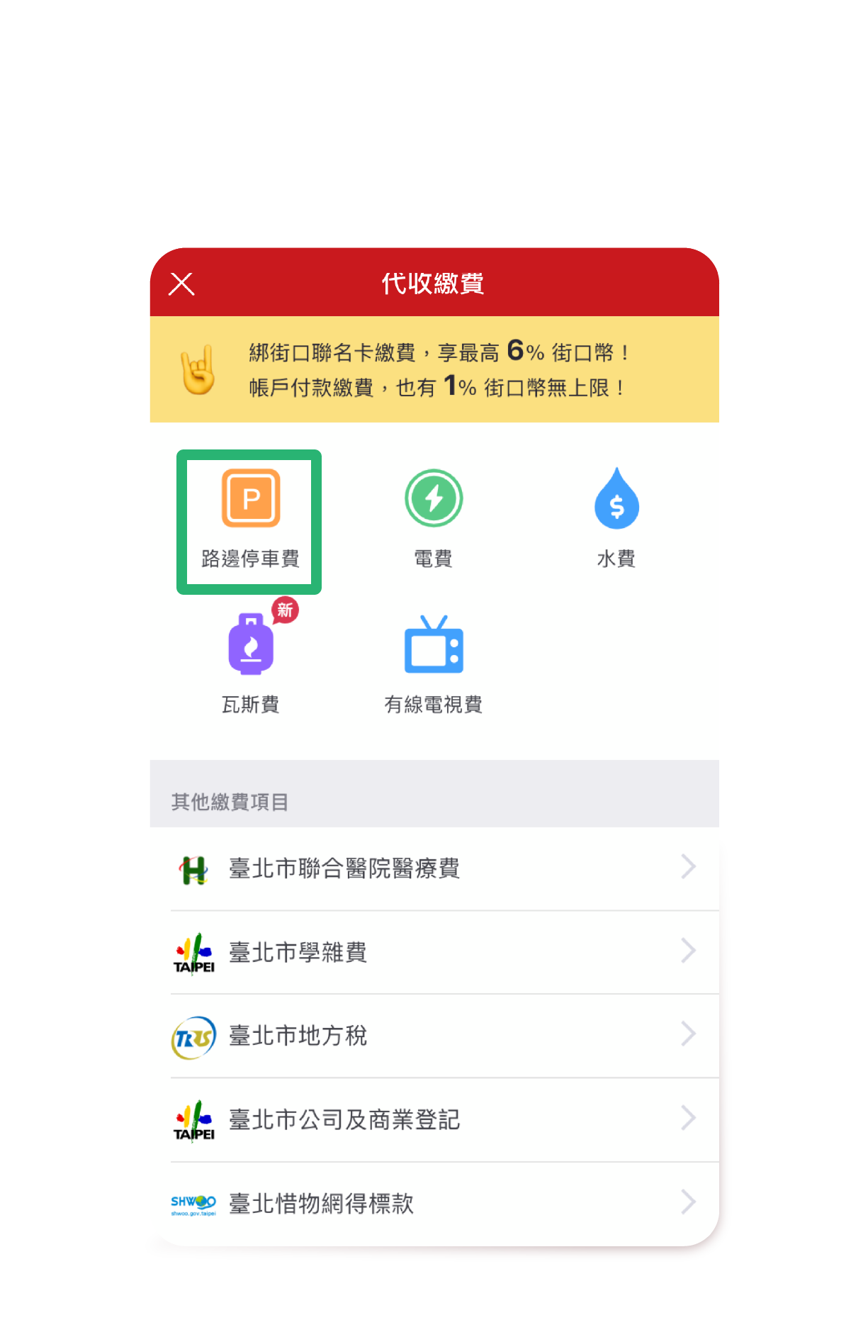 - 每人每月於所有「指定縣市路邊停車費」繳費,合計共享10筆現金回饋。