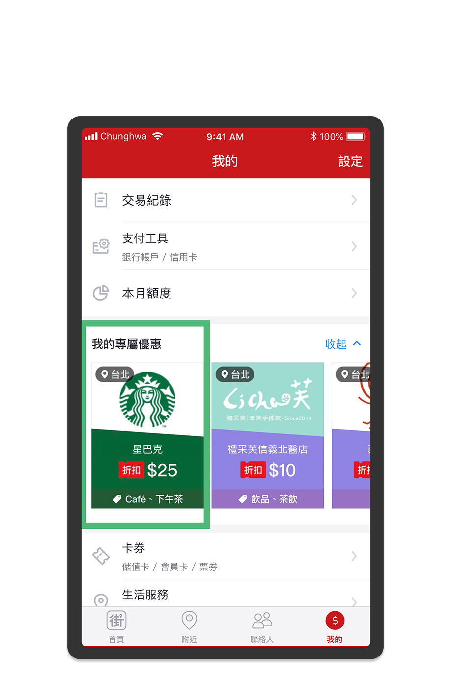 - *查詢星巴克街口券請至APP「我的」>「我的專屬優惠(展開)」;或至「我的」>「卡券」>「街口券」。