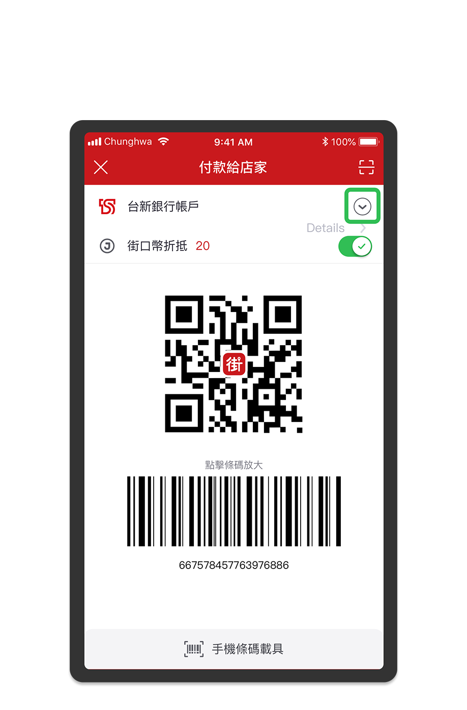 - *若於適用「出示付款碼」的店家有可用的街口券,您無法自行選擇不用街口券(出示付款碼畫面不會顯示該券,僅會在結帳完成後自動完成折抵,可於交易紀錄頁面查看)。
